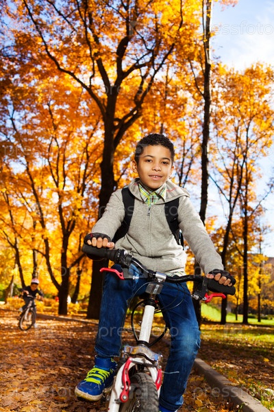 Счастливый мальчик на велосипеде в парке