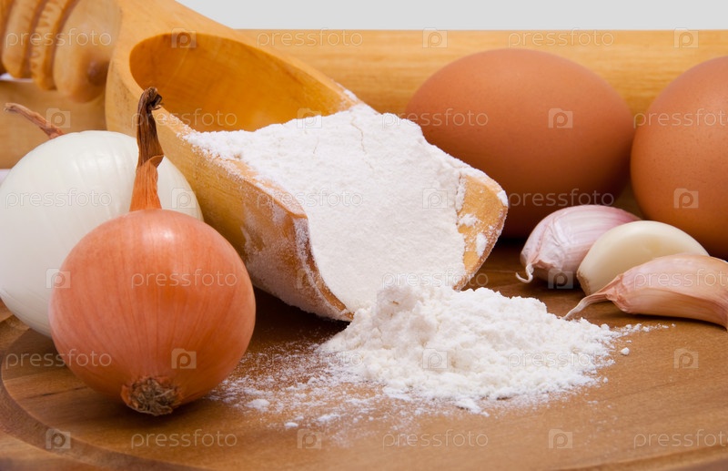 Лук, яйца, чеснок, мука, совок на деревянной доске