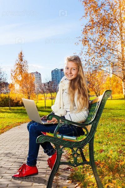 Школьница с ноутбуком в парке