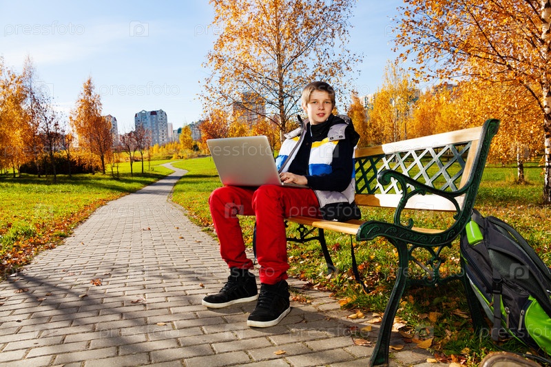 Мальчик с ноутбуком в парке