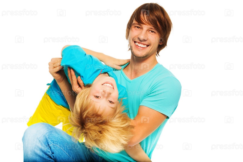 Маленький мальчик с отцом на белом фоне