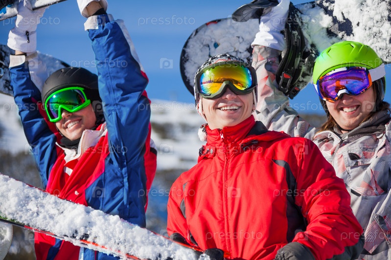 Счастливые сноубордисты позируют на склоне горы