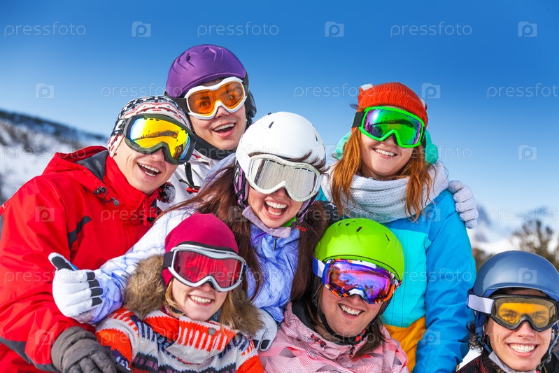 Счастливые сноубордисты позируют на склоне горы