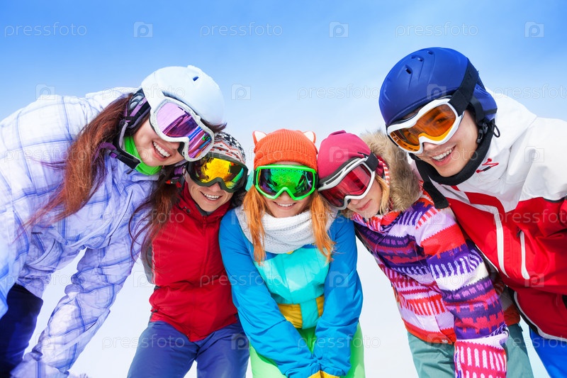 Счастливые сноубордисты позируют на свежем воздухе зимой