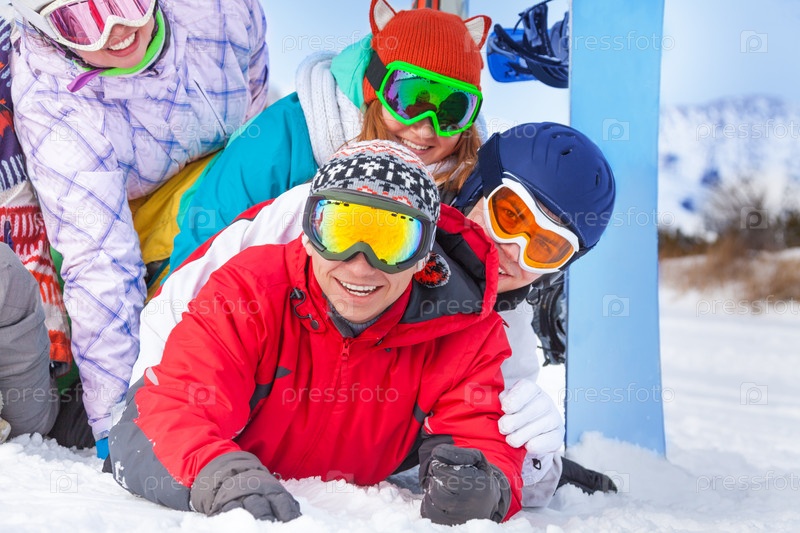 Счастливые сноубордисты позируют на свежем воздухе зимой