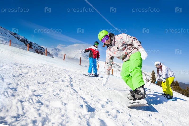 Счастливые сноубордисты позируют на свежем воздухе зимой