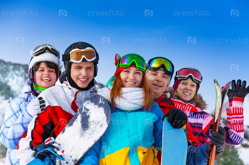 Счастливые сноубордисты и лыжники позируют на свежем воздухе зимой