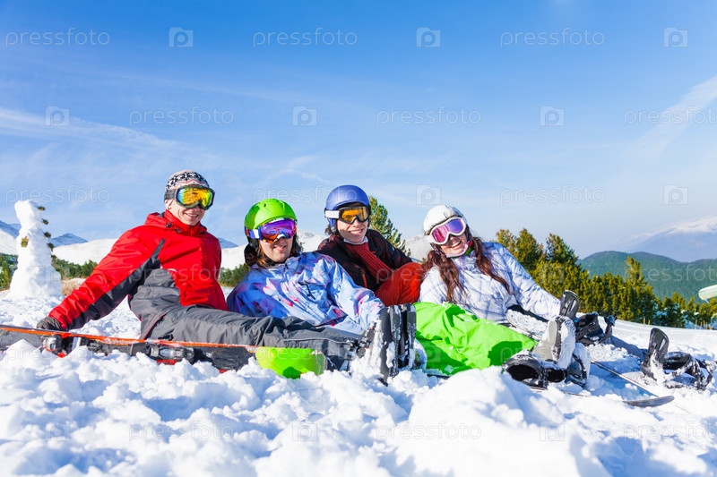 Счастливые сноубордисты и лыжники позируют на свежем воздухе зимой