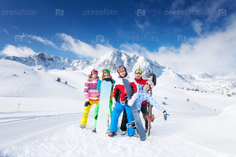 Счастливые сноубордисты и лыжники позируют на свежем воздухе зимой
