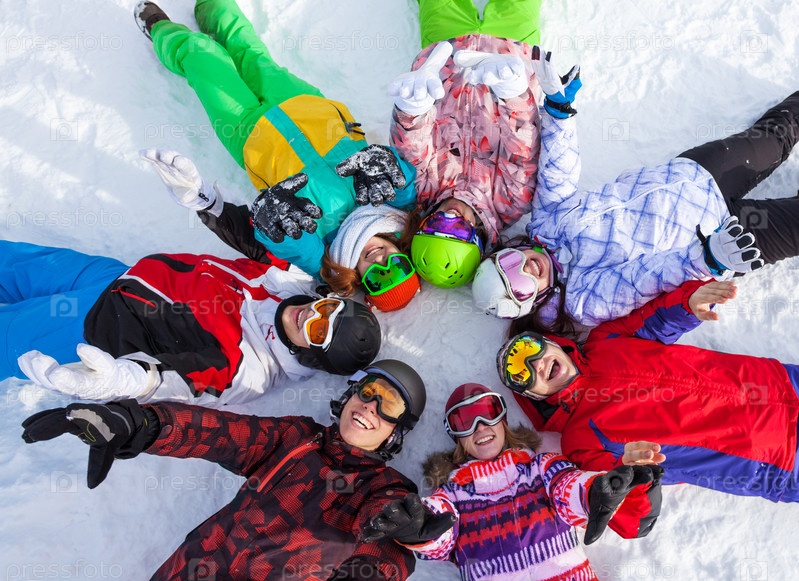 Счастливые сноубордисты позируют на свежем воздухе зимой