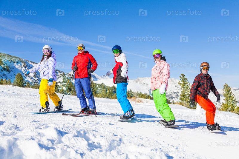 Счастливые сноубордисты и лыжники позируют на свежем воздухе зимой