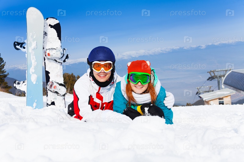 Счастливые сноубордисты позируют на склоне горы