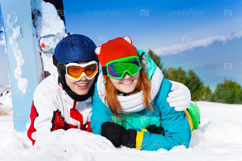 Счастливые сноубордисты позируют на склоне горы