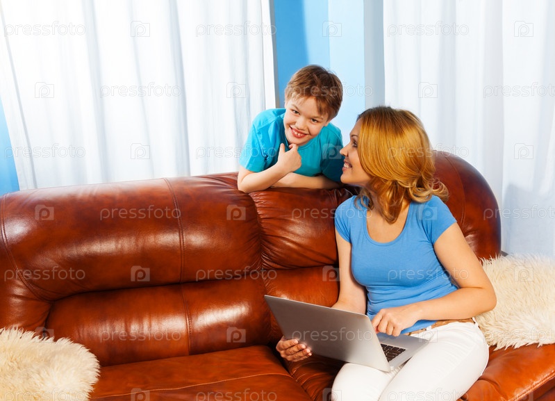 Мать и сын с ноутбуком на диване