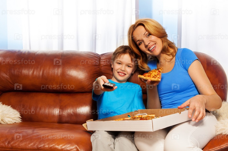 Мать с сыном едят пиццу перед телевизором
