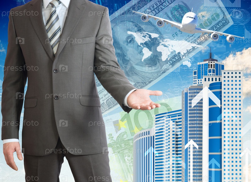 Бизнесмен на фоне графиков и зданий