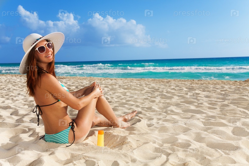 Красивая женщина в купальнике и шляпе позирует на белом песчаном пляже