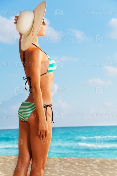 Красивая женщина в купальнике и шляпе позирует на белом песчаном пляже