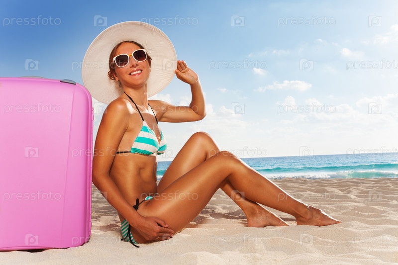 Женщина с розовым чемоданом на пляже