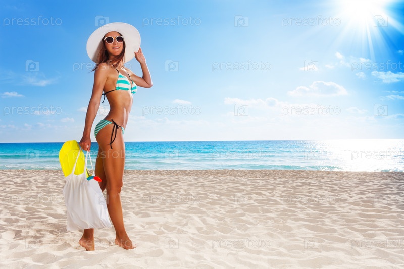 Красивая женщина в купальнике и шляпе позирует на белом песчаном пляже