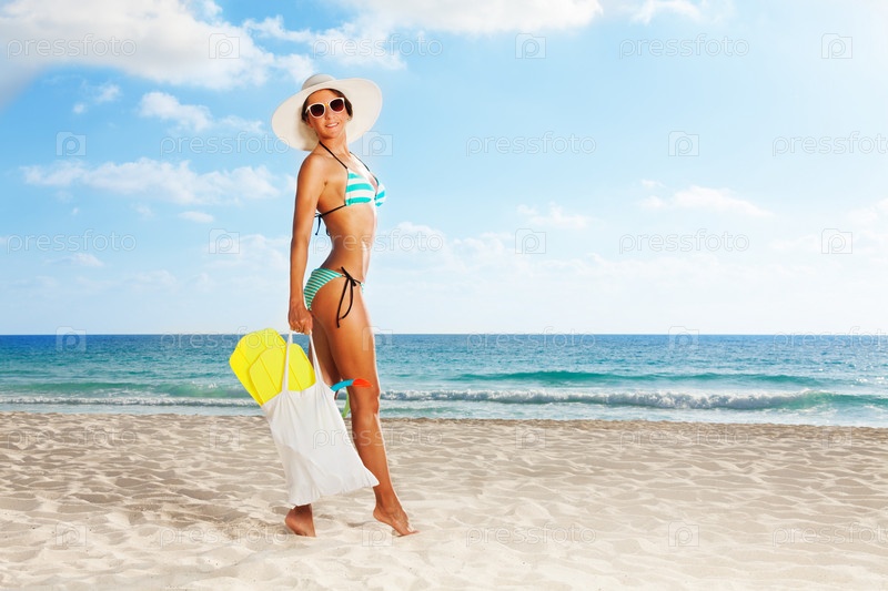 Красивая женщина в купальнике и шляпе позирует на белом песчаном пляже