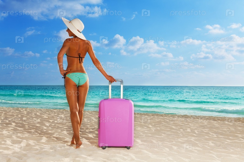 Красивая женщина в купальнике и шляпе позирует на белом песчаном пляже