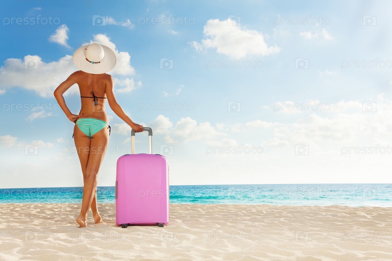 Красивая женщина в купальнике и шляпе позирует на белом песчаном пляже