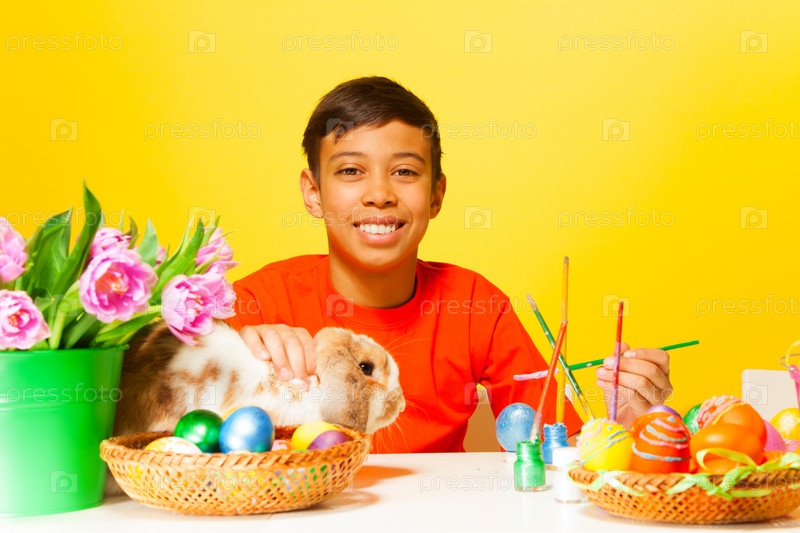 Улыбающийся мальчик красит пасхальные яйца