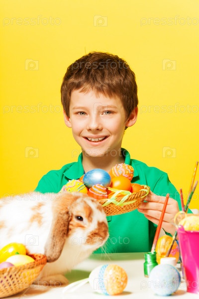 Улыбающийся мальчик красит пасхальные яйца