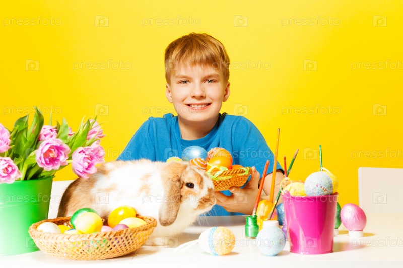 Улыбающийся мальчик красит пасхальные яйца
