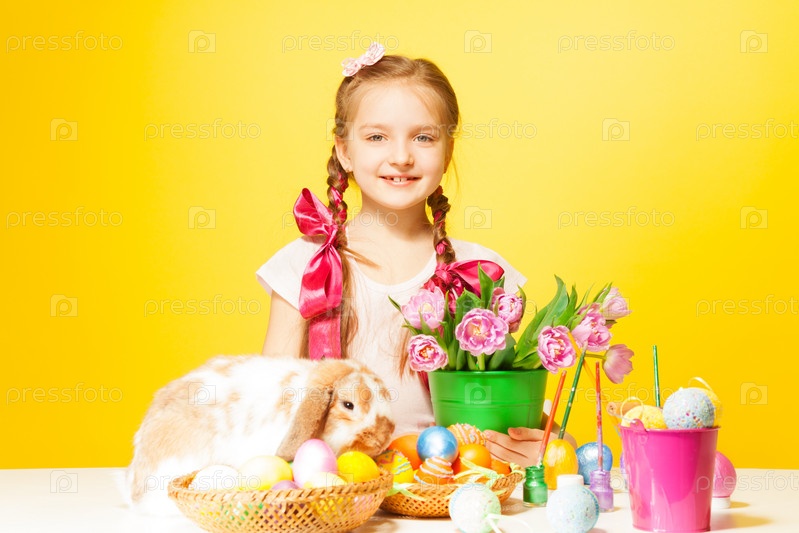 Девочка с пасхальными яйцами и кроликом на желтом фоне