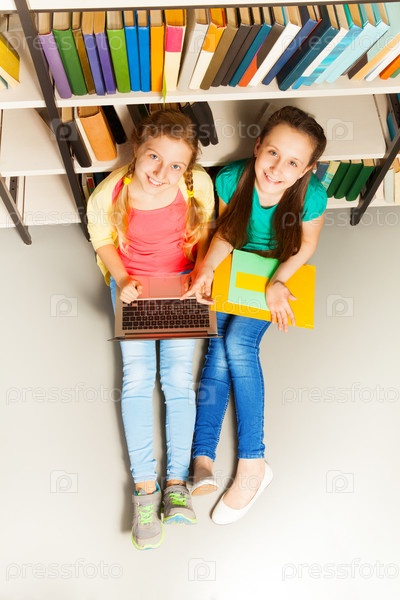 Две счастливые девочки на полу в библиотеке