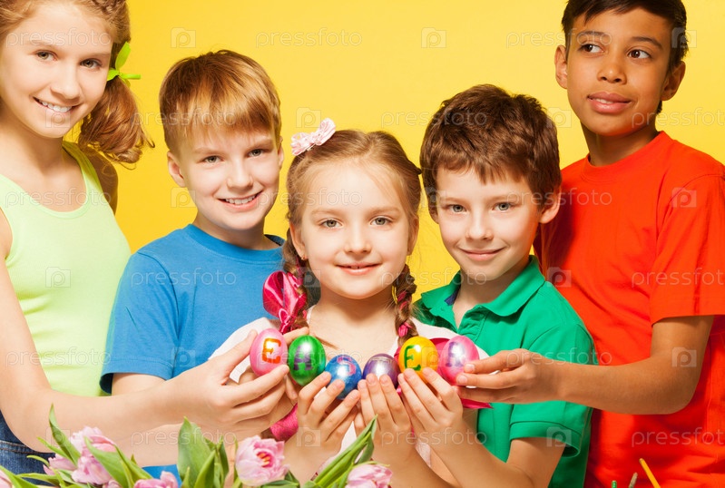 Дети с тюльпанами и пасхальными яйцами на желтом фоне