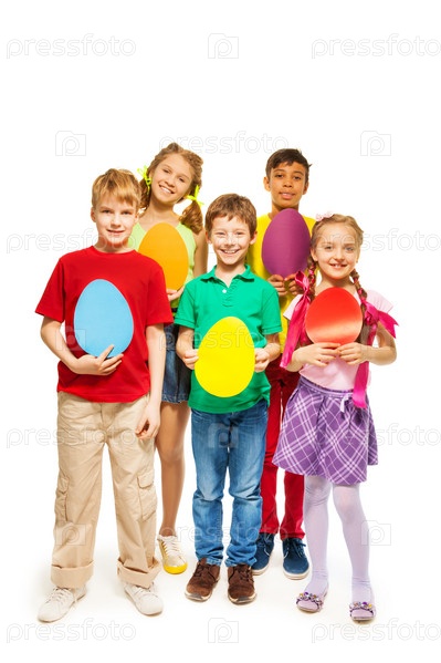 Дети держат бумажные цветные яйца на белом фоне