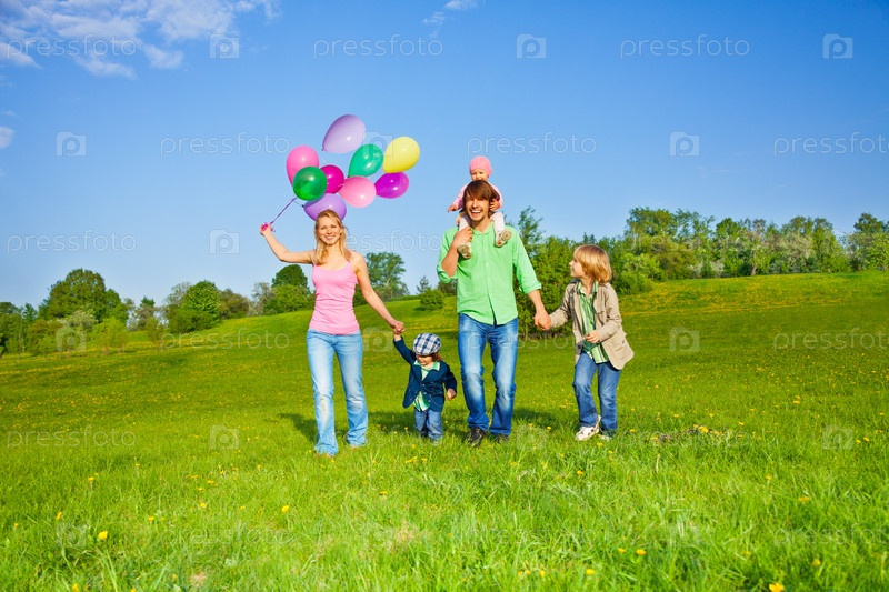 Счастливая семья ходит с воздушными шарами в парке