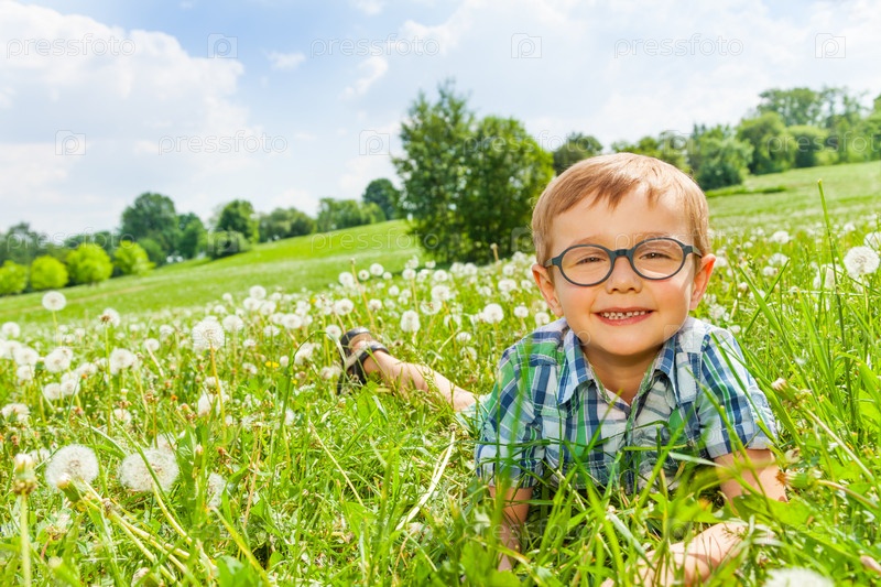 Улыбающийся мальчик лежит на траве