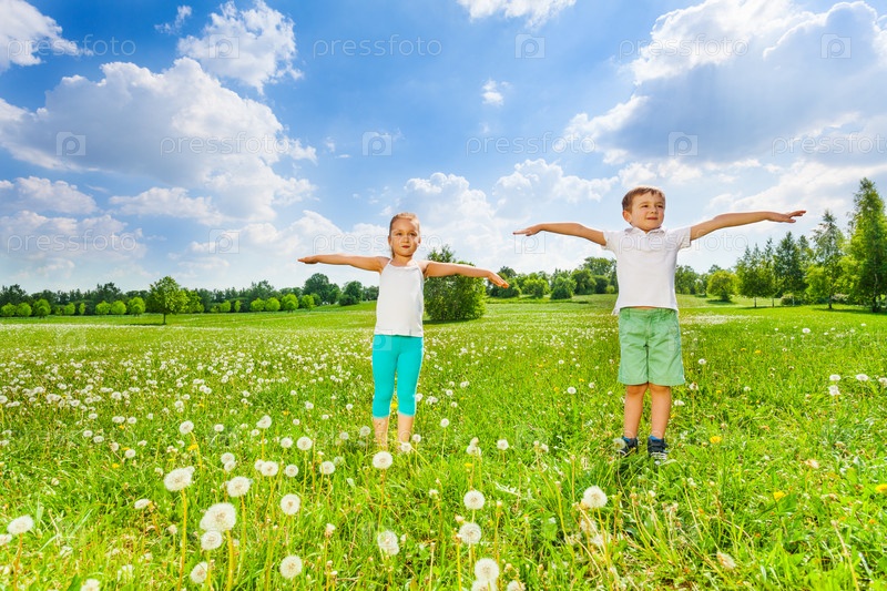 Двое детей делают гимнастику на траве
