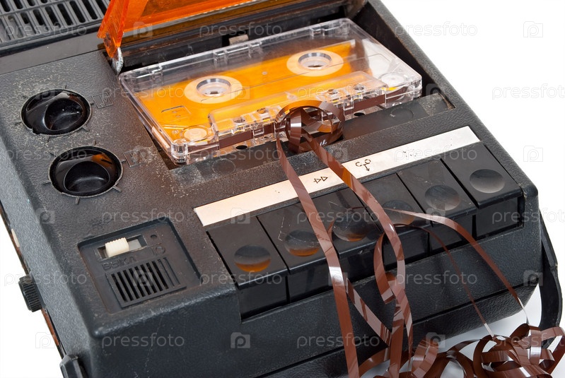 Старый магнитофон с аудиокассетой на белом фоне