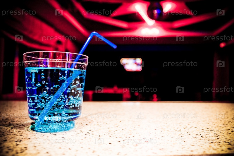 Голубой коктейль с соломкой на столике в ночном клубе