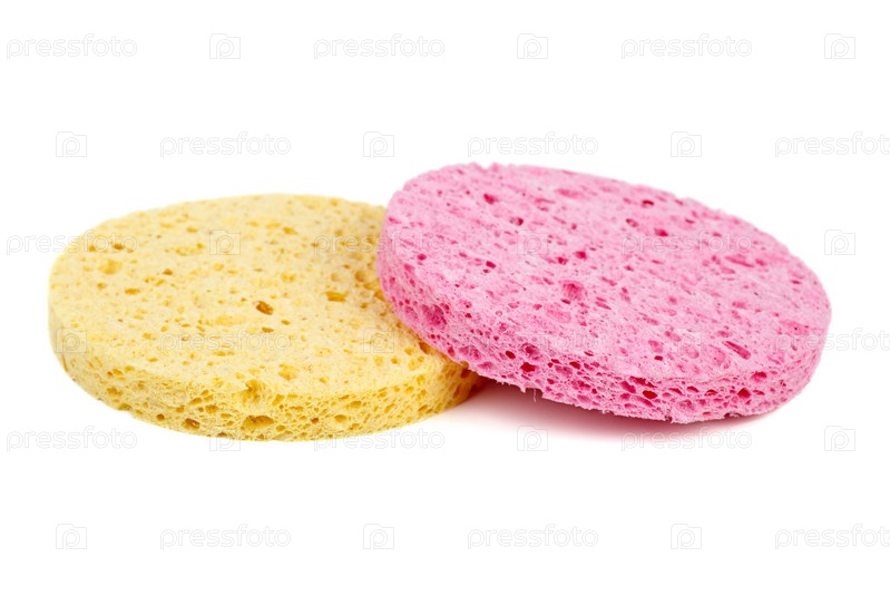 Косметические губки розового и желтого цветов на белом фоне