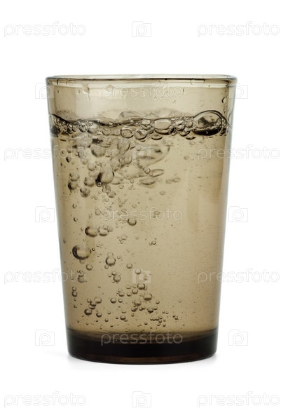 Стакан из темного стекла с газированной минеральной водой на белом фоне