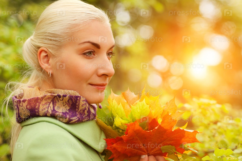Молодая красивая женщина с букетом осенних листьев в парке