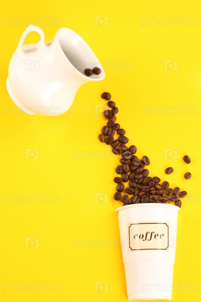 Полный стакан кофейных зерен, сыплющихся из керамического кувшина