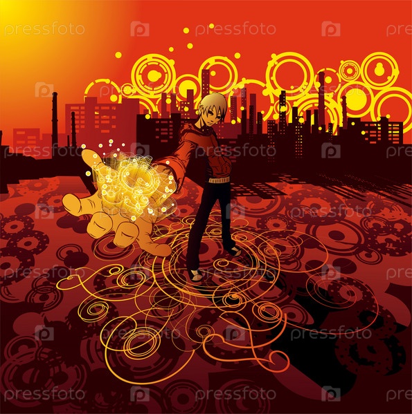 Подросток с вытянутой рукой на фоне светящегося города. Векторный рисунок