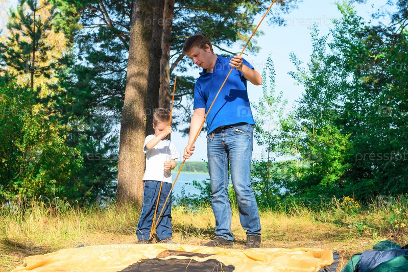 Отец и сын ставят палатку в кемпинге