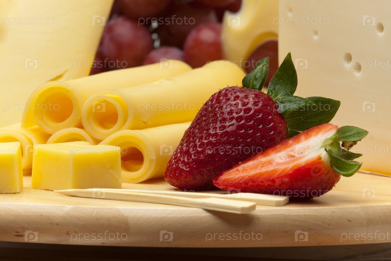 Сыр, клубника и виноград на деревянной доске
