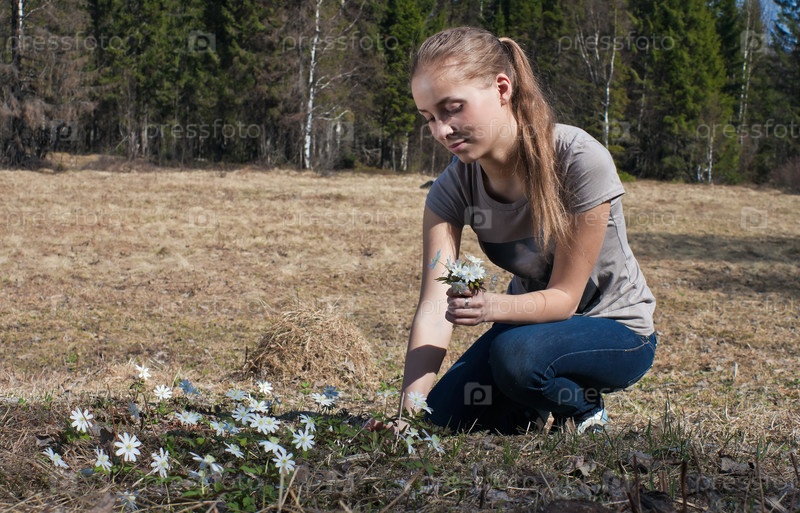 Девушка собирает подснежники
