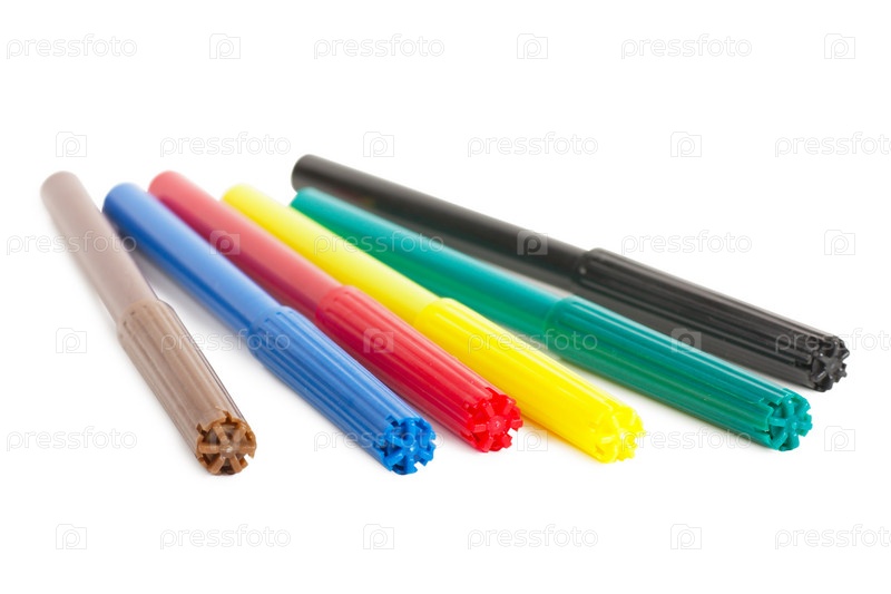 Шесть красочных фломастеров на белом фоне