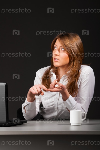 Бизнес-леди на рабочем месте за ноутбуком ведет подсчет