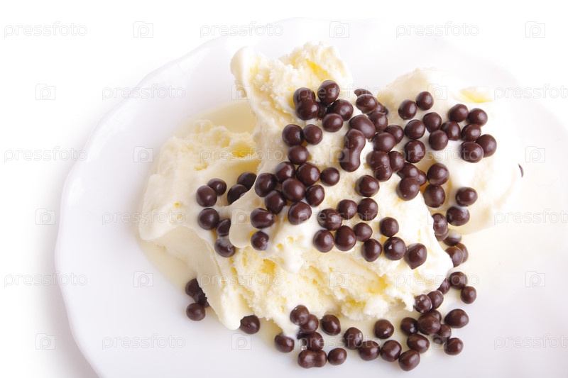 Сладкое мороженое на белой тарелке (изолированное, с близкого расстояния)